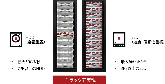 例えば4Uに60ドライブを格納する小規模な構成からスタートし、その後は必要に応じて容易に総容量を拡張可能です。4Uに84ドライブを搭載可能なエンクロージャーを4つまで追加可能な拡張性を持っています。こうして拡張していくことで、全体のTOC を最小化しながら、数GB/秒のI/Oを数百同時実行可能な性能を発揮するPBクラスのシステムに統合することができます。SSDの構成で3PB以上、最大660GB/秒、HDDで構成すれば7PB以上、最大50GB/秒を1ラックで実現可能です。